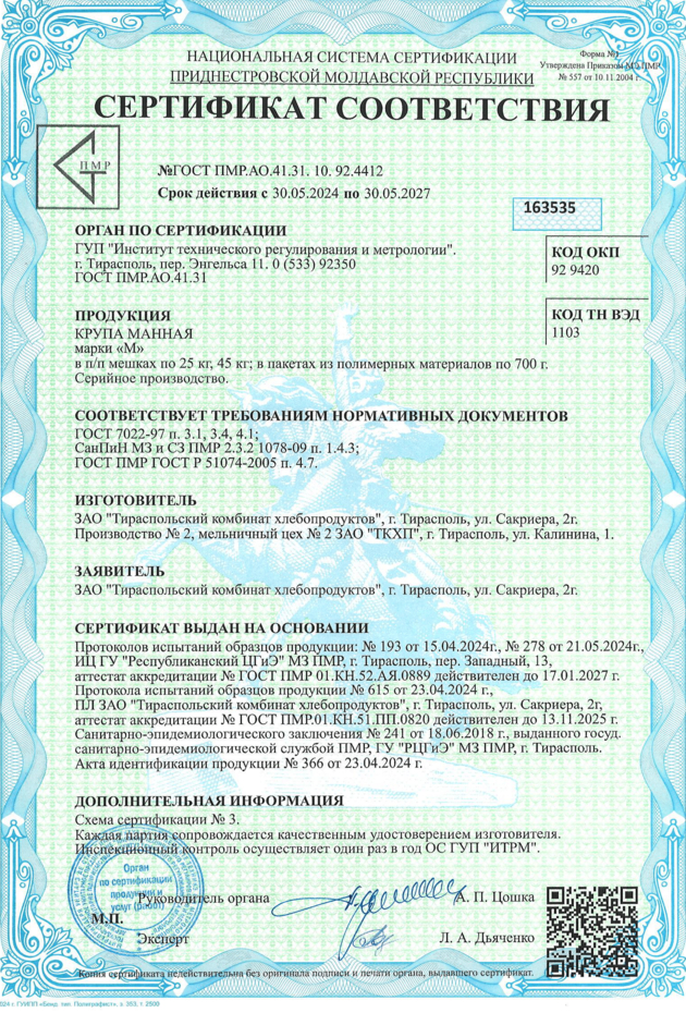 CJSC “Tiraspol Cereal Complex” offers a wide range of grain processing products: wheat flour of the highest and first grades, rye flour, as well as cereals - buckwheat, semolina, pearl, barley, wheat, pea. All products are manufactured in compliance with strict quality standards and guaranteed stability of characteristics.