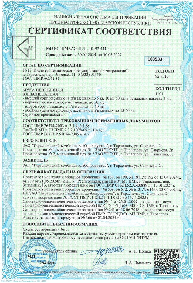 ЗАО «Тираспольский комбинат хлебопродуктов» предлагает широкий ассортимент продукции зернопереработки: пшеничную муку высшего и первого сортов, ржаную муку, а также крупы — гречневую, манную, перловую, ячневую, пшеничную, гороховую. Вся продукция производится с соблюдением строгих стандартов качества и гарантированной стабильностью характеристик.
